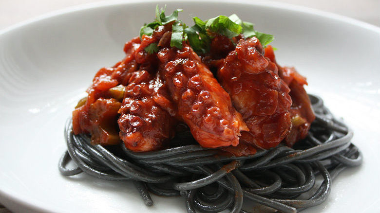 Braised octopus with squid ink spaghetti