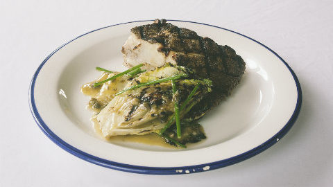 Using a very hot griddle pan mark the lettuce on both sides and put somewhere warm while the fish cooks. Cook the fish dark side down first for about 3 minutes, then flip it over and cook for a further 2, finish in a 200 degree oven for 3 minutes. To serve, toss the warm baby gem through the dressing and plate two pieces with each tranche.