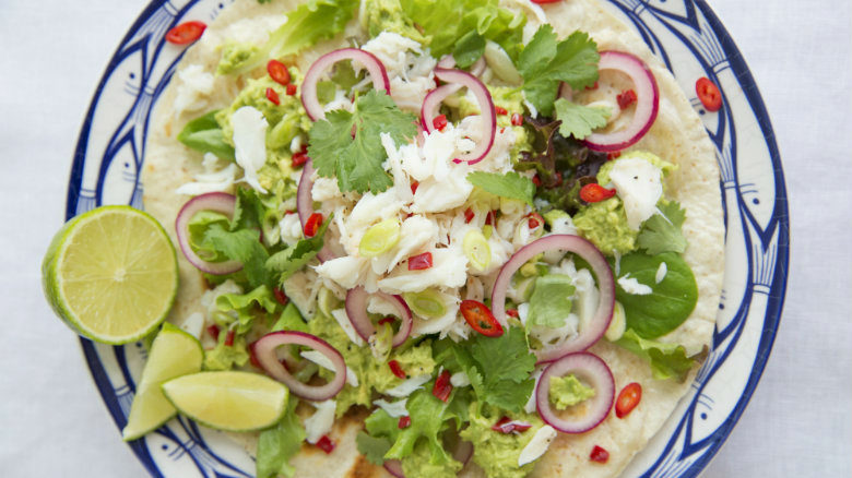 Put the toasted tortillas on two plates and spread over the brown crabmeat mixture. Top with the salad leaves, mashed avocado, white crabmeat, onion and chilli if using. Garnish with the coriander and serve with lime wedges for squeezing over.