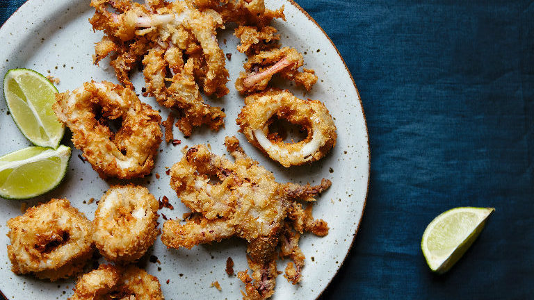 Make sure the oil comes back up to heat before adding any more – too cool and the squid will be pale and oily, too hot and the coconut will burn. Serve with the lime wedges.