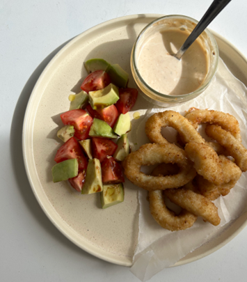 Calamari style cuttlefish with avocado & tomato salad and pepper yoghurt dip. Estimated price per portion £2.50
