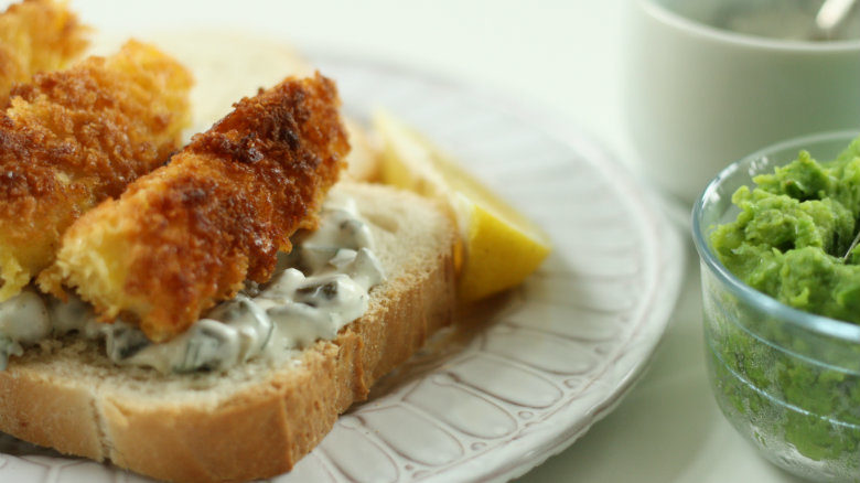 Fish finger sandwich with tartare sauce and minted mushy peas