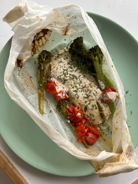 3. Take two large squares of parchment paper and place the fish in the centre, arrange the broccoli and tomatoes around and squeeze the lemon juice all over both.