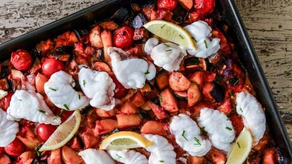 Preheat the oven to 200C/fan 180C/gas mark 6. Chop the potatoes and all the vegetables into pieces a little smaller than the size of the cherry tomatoes and add to a large roasting tray with the olive oil and lemon juice. Chop the aubergine last and make sure it’s tossed in the oil and lemon to stop it browning.