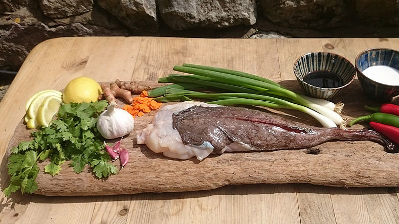 To finish, place the pieces of monkfish into the simmering sauce and gently poach for about 5 minutes. Add the remaining coriander, chilli and the spring onion. Squeeze in the rest of the lemon juice. Stir gently and allow to simmer for another 5 minutes to barely cook the vegetables which should be vibrantly coloured by the short cooking time. Serve over the lemon and garlic rice with the stir-fried samphire as a side dish.