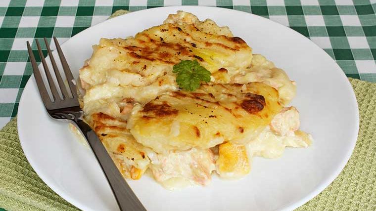 Butter an ovenproof dish. Cut the raw fish into chunky pieces and place at the bottom of the dish. Sprinkle over the sliced leeks, then pour over the sauce. Spread the mashed potato on top and sprinkle with the grated cheese.
