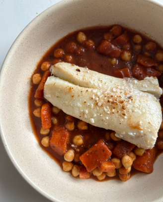 This cod alternative, found across the UK, is paired perfectly with a sweet potato and chickpea stew.