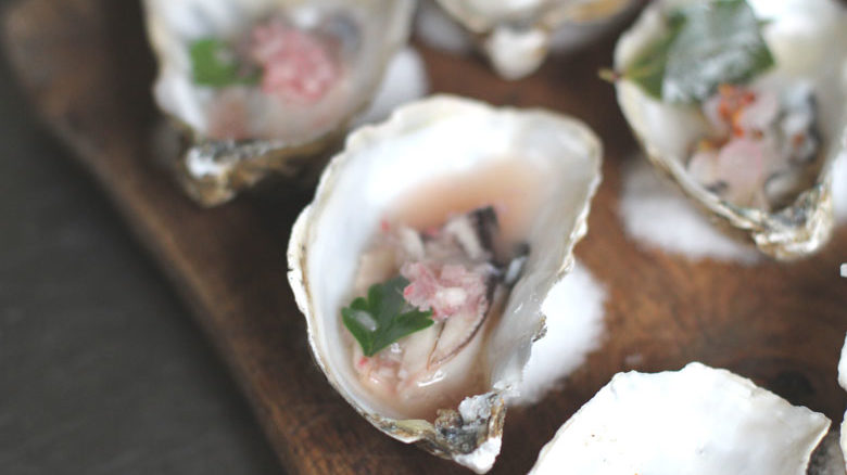 Cut the remaining rhubarb into a very fine dice. Serve the oysters in the shell with some of the juice and decorate with a half a teaspoon of diced rhubarb and a small parsley leaf.