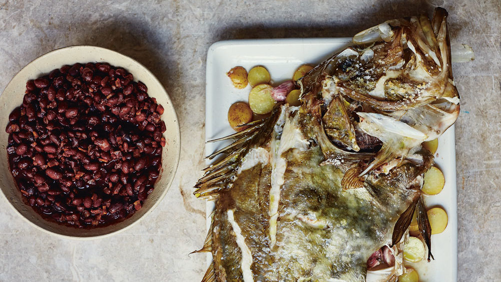 When almost cooked, preheat the oven to 180°C (350°F /Gas 3). Scatter the potatoes and garlic in the bottom of a large roasting tin. Place the John Dory on top, drizzle with plenty of olive oil and season well. Roast for 30–40 minutes until just cooked. Test by inserting a sharp knife into the flesh; when it pulls away from the bone easily, it’s done.