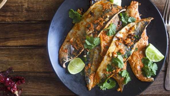 Preheat the oven to 190°C/fan 170°C/gas mark 5. Roast the sweet potatoes for 40 minutes in the marinade. Add the tray of mackerel for the last 8 minutes of the cooking time.