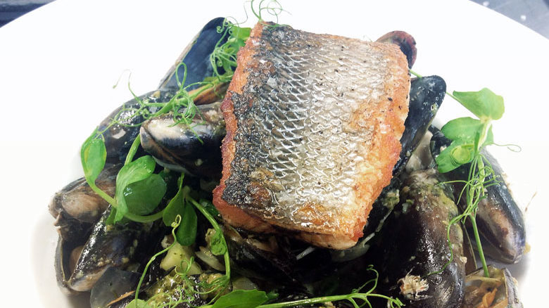 Check that all the mussels are open, and then add the samphire, cucumber and pesto the pan. Cook for one more minute, and then tip the mussels and juices into a bowl. Top with the sea bass fillet and garnish with pea shoots.