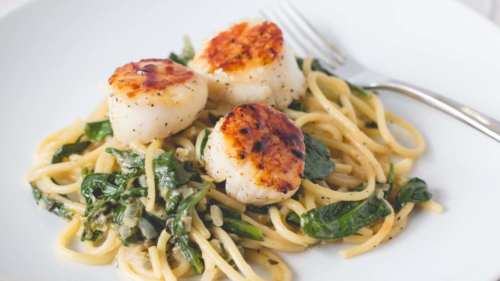 Remove the pan from the heat. Add the Parmesan cheese, a little bit at a time, until all the cheese is fully incorporated. Once the spinach is wilted and the ingredients are fully incorporated, transfer to a serving bowl or plate and top with the scallops. Serve with a bit of fresh lemon squeezed over the entire dish.