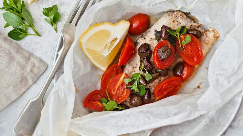 Baked fish with tomatoes and olives is an Italian favourite. The parchment cooking technique of this recipe, known in Italian as al cartoccio, encourages the bass to take on the character of the super-sweet datterini tomatoes and the mild and fruity taggiasche olives.