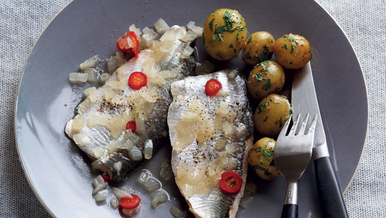 Toss the boiled new potatoes in the melted butter with chopped parsley and serve alongside the chilled soused herrings. Decorate with the chilli and onion from the sauce.