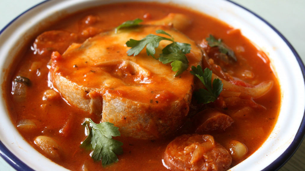 Place the circles of hake on top of the tomato sauce. If you have a lid for the shallow casserole dish, put it on – and if you’re using a frying pan, then put a flat tray on top, so that you create a nice steamy environment, and there isn’t too much liquid evaporating off the sauce. Cook the circles of hake for 4-5 minutes on one side. Turn them over, and cook in the same way for the same amount of time on the other side.