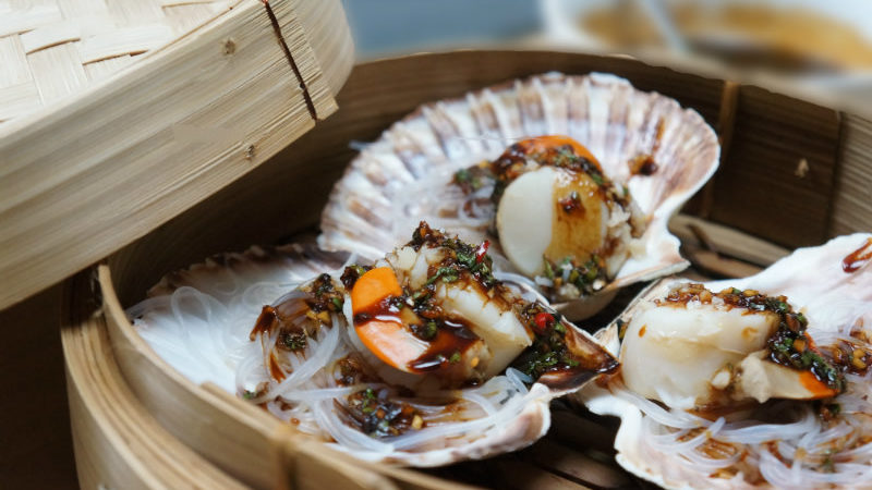 Setup a steam stand in a wok, with boiling water half way up the wok. Place the scallop shells on a suitable steaming plate. Cover with a lid and steam the scallops in their shell on high heat for 3-5 minutes depending on the size.