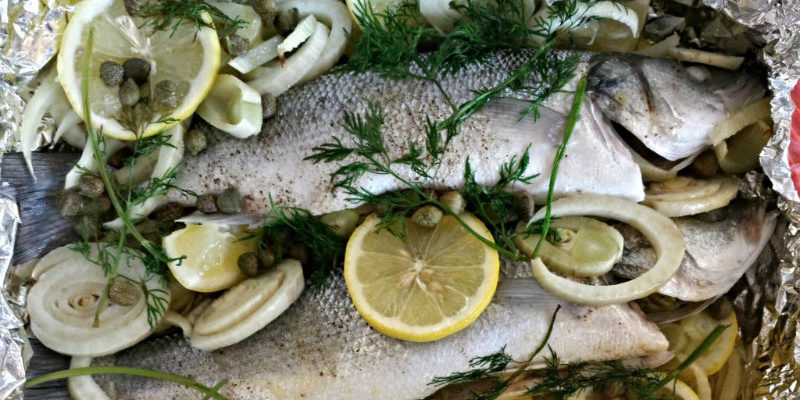 Slice the fennel in fine, fine slices. Place the fronds and sliced fennel inside the fish cavity. Then sprinkle the caper and line the lemon slices on top of the fennel.